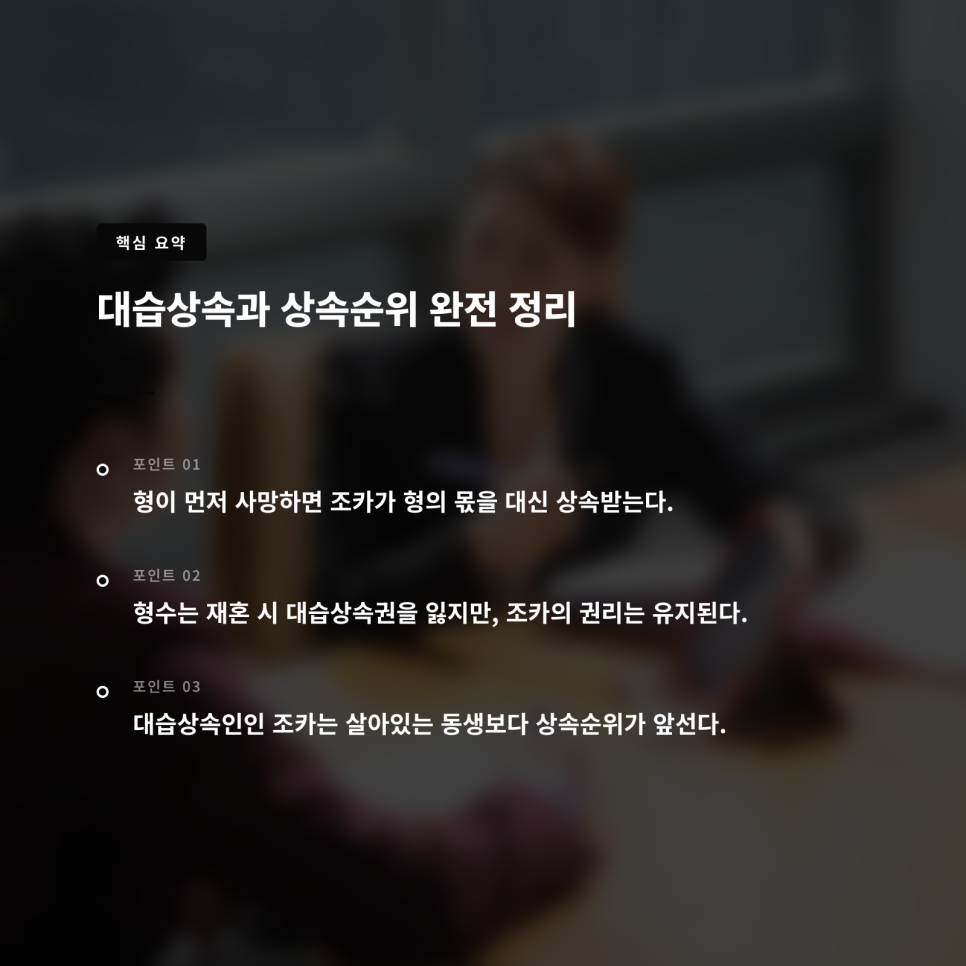 여기서 중요한 점은, 대습상속이 발생하면 죽은 형의 자녀들이 '형의 지위'를 그대로 이어받아 1순위 자리에 앉게 된다는 것입니다. 즉, 살아있는 동생(3순위)보다 죽은 형의 아들(조카, 대습상속인으로서 1순위)이 우선순위를 갖게 됩니다.
