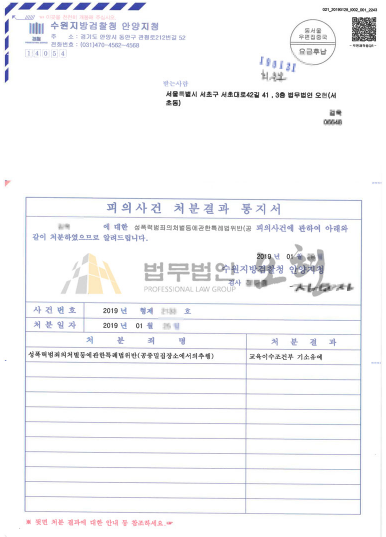 이후 수사기관에 합의서와 의뢰인의 기타 정상 사정을 기술한 변호인 의견서를 제출하였습니다. 결국 검찰은 본 법무법인의 변론을 받아들여, 의뢰인에 대하여 교육조건부 기소유예 처분을 내림으로써 사건은 무사히 마무리 되었습니다.