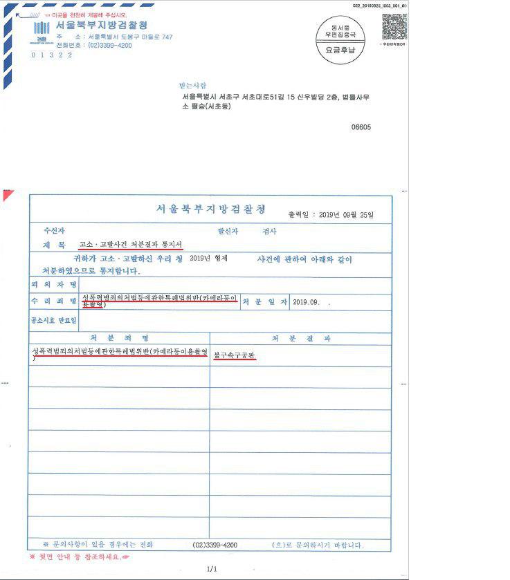 가해자의 증거인멸 행위로 인해 가해자의 처벌이 이루어지지 않을 상황으로 진행되고 있었으나 경찰 단계에서부터 김준환 변호사를 통한 적극적인 고소 진행을 통하여 가해자의 범행 증거를 확보하였습니다. 뿐만 아니라 가해자의 과거 추가 촬영 내용까지 증거로 확보를 하였습니다. 이에 서울북부지방검찰청은 가해자의 카메라등이용촬영 혐의가 입증되었다고 판단하여 "기소"처분을 하였습니다.