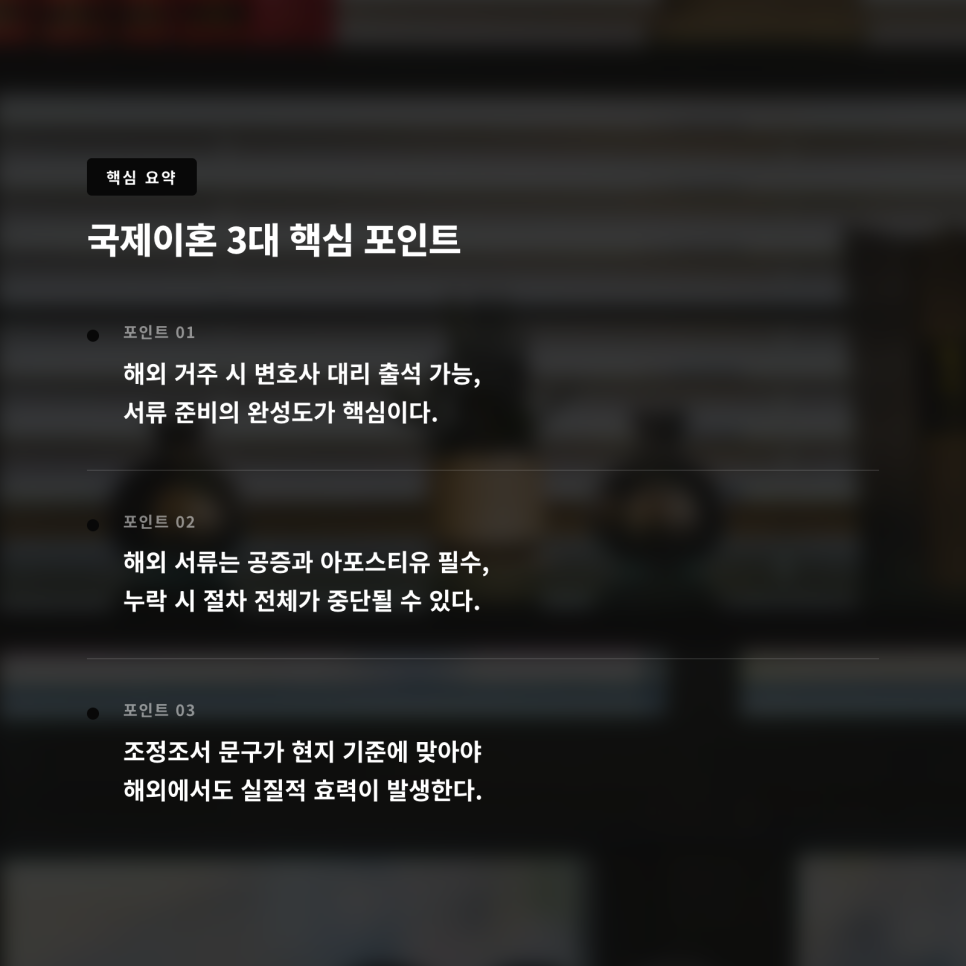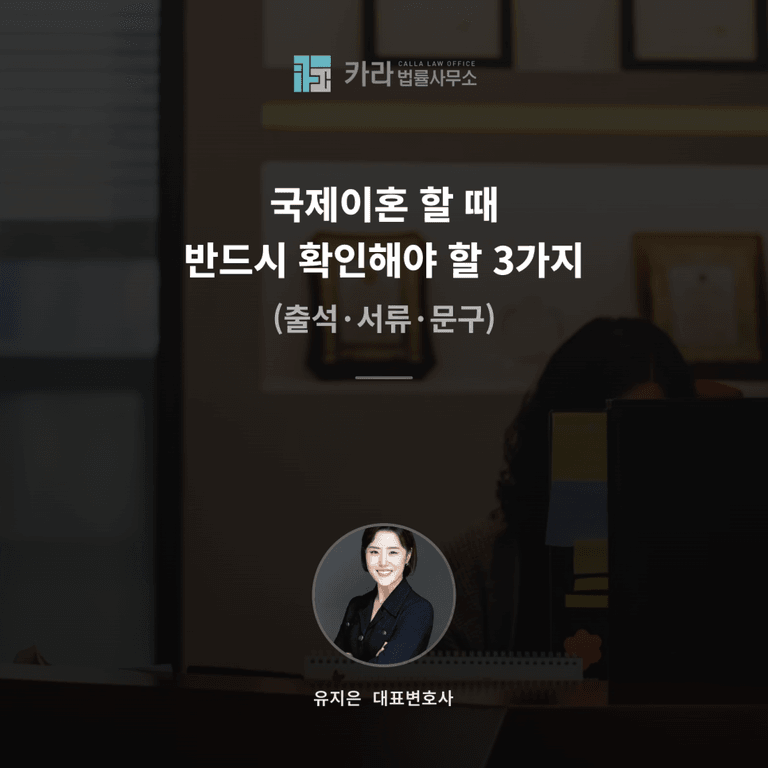 국제이혼을 준비하고 있다면 지금 확인해야 할 것은 “이혼이 되는가”가 아니라 “문제 없이 끝나는가”입니다. 앞서 언급한 출석/서류/문구 이 세가지를 정확히 확인하지 않는다면 이혼절차가 지연되거나 이혼 후에도 문제가 생길 수 있다는 사실을 유념하시기 바랍니다.