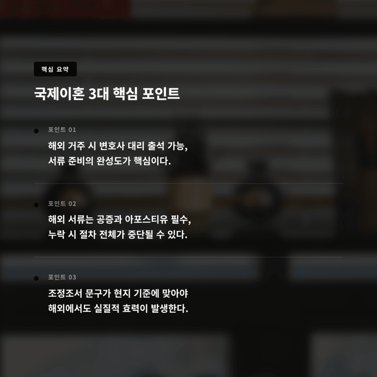 이런 상황을 막으려면 처음 조정 문구를 작성할 때부터 해외 집행까지 고려해야 합니다. 영문 병기 문구를 넣거나 현지 법령에 맞춘 구체적인 표현을 명시하는 것이 필요한데, 이 부분은 국제이혼 경험이 풍부한 전문가와 함께 검토하지 않으면 나중에 돌이키기 어렵습니다.