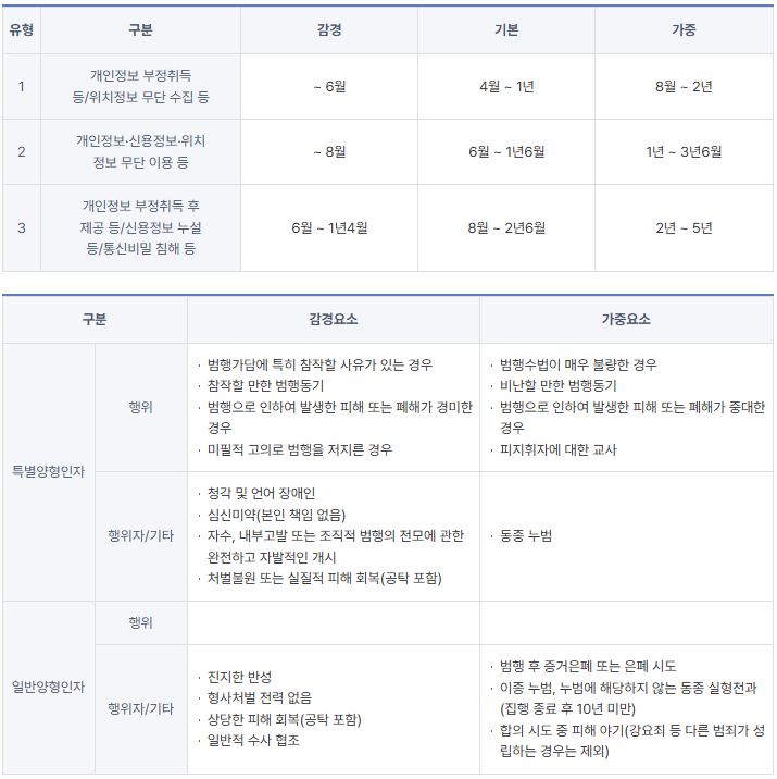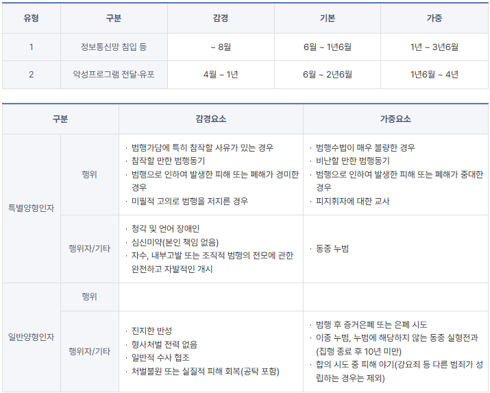 조직적으로 범행을 꾀하거나·반 년 이상 장기간이거나·지인소개등 그 죄책이 가볍지 않다고 판단되면, 99조를 제외한 나머지 범죄 유형의 경우 초범이라 하더라도 실형이나 구속, 압수수색이 병행 될 수 있습니다. 양형의 경우 침해·이용등에 따라 특별·일반 양형인자가 구분되며, 각 감경 및 가중의 요소가 모두 다르니 꼭 참고하시길 바랍니다.