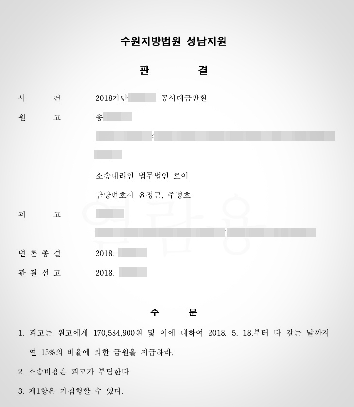 본 소송에서 의뢰인이 많은 금액을 돌려받을 수 있던 것은 제가 기존에 포스팅한 것과 같이 공사계약 체결 당시 추가 공사비에 대한 계약을 아주 잘 체결하여, 특별한 사정없이 추가 공사비 요청한 공사업체의 요구가 부당한 것이 소송을 통하여 확정이 되어, 공사의 기성고에 따른 공사비와 지체 상금을 전액 돌려받게 된 것입니다.
