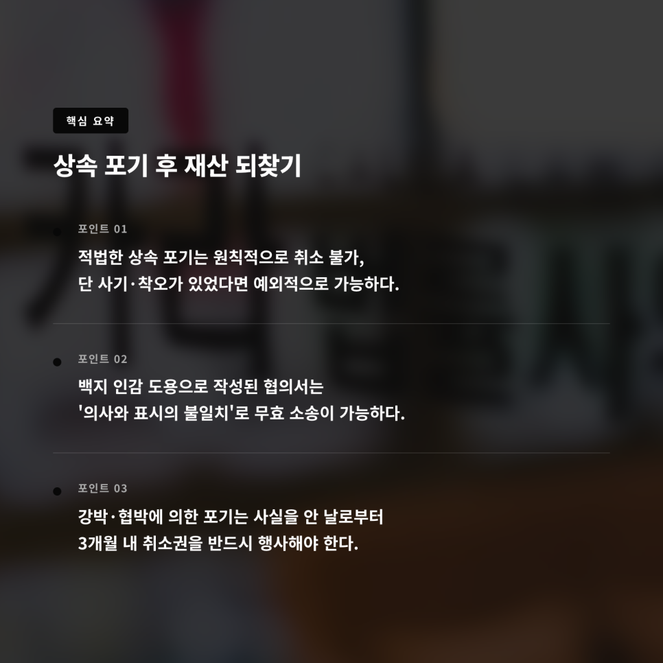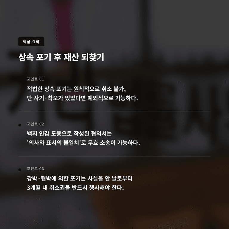 상속 문제에서 가장 뼈아픈 순간은 '잘 모르고 한 포기'가 나중에 큰 후회로 돌아올 때입니다. 특히 가족 간의 의리나 강요 때문에, 혹은 정확한 재산 규모를 모르는 상태에서 도장을 찍어준 뒤 뒤늦게 후회하시는 분들이 많은데요, 이때 많은 분들이 상속 포기 후 재산을 되찾을 수 있는 방법을 찾게 되지만 대부분의 경우 쉽지는 않습니다.