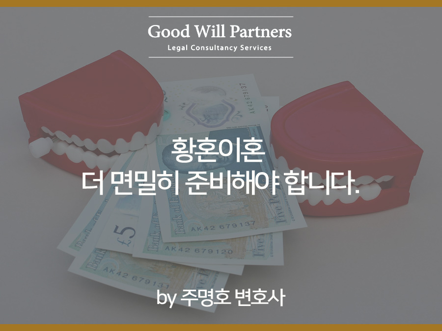 하지만 역시 재판은 증거에 의하여만 좋은 결과를 기대할 수 있음으로, 황혼 이혼에서는 몇 가지 필수적인 부분들에 대해서 주의를 해야 합니다.