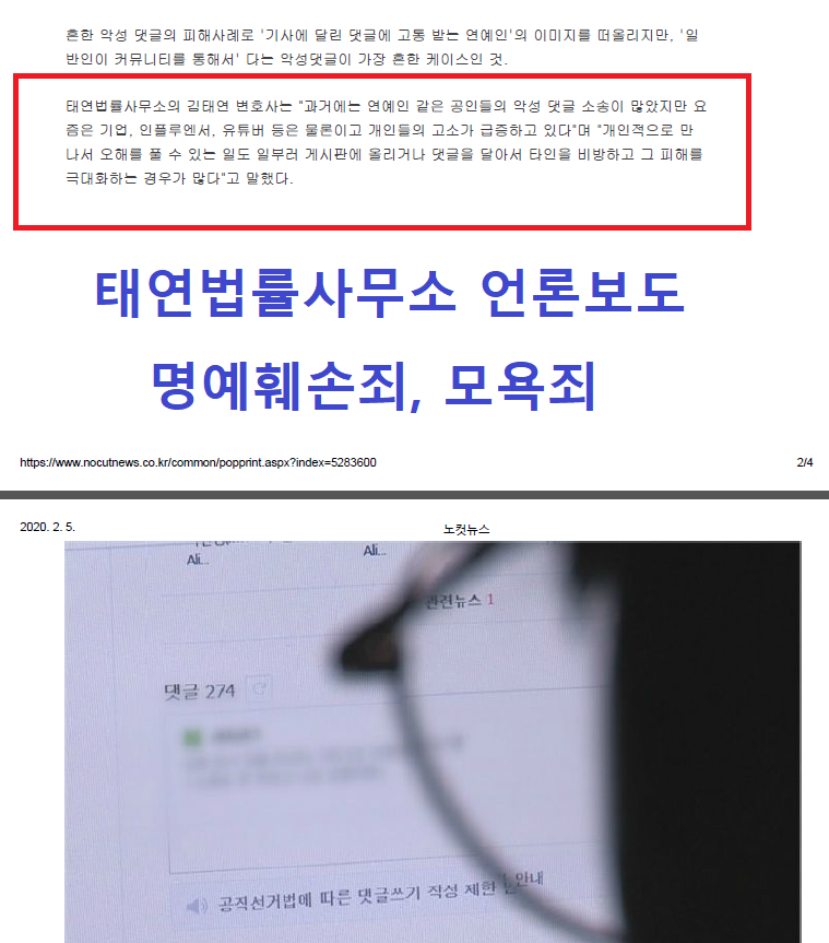 태연법률사무소 대표 김태연변호사님께서는 많은 언론 인터뷰 요청을 받 계십니다만 그 중 태연법률사무소에서 진행 중인 수많은 연예인들 관련 악플 사건 보도도 많습니다.