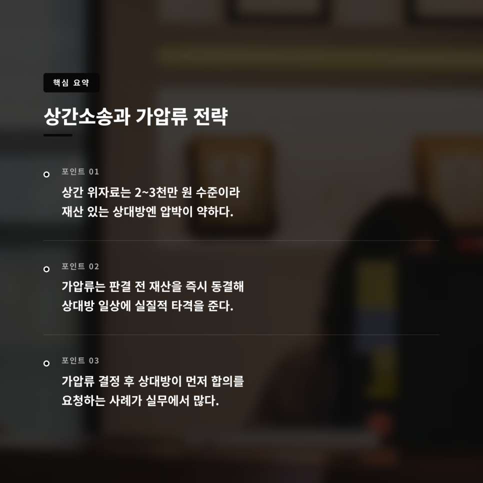 실제로 적반하장으로 나오던 상간녀가 가압류 결정 직후 "위자료와 소송 비용을 일시불로 드릴 테니 가압류만 해제해 달라"며 먼저 연락을 해오는 사례가 적지 않습니다. 소송보다 가압류가 훨씬 빠르게 상대방의 태도를 바꿔놓는 이유입니다.