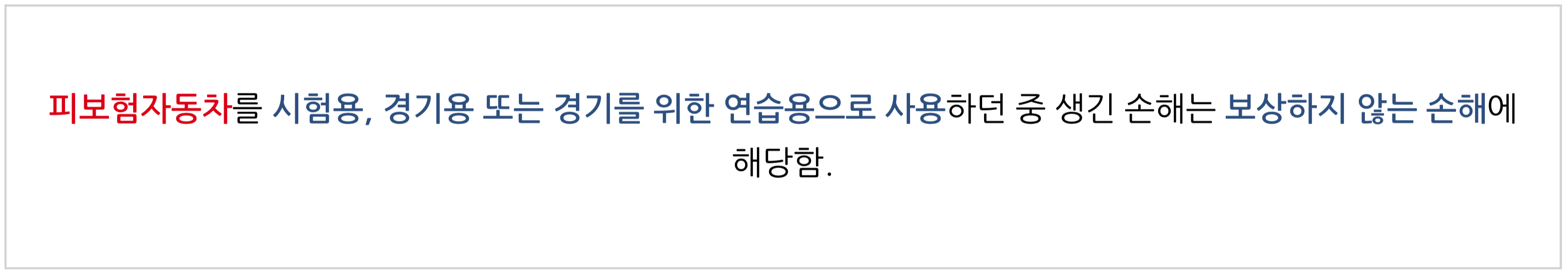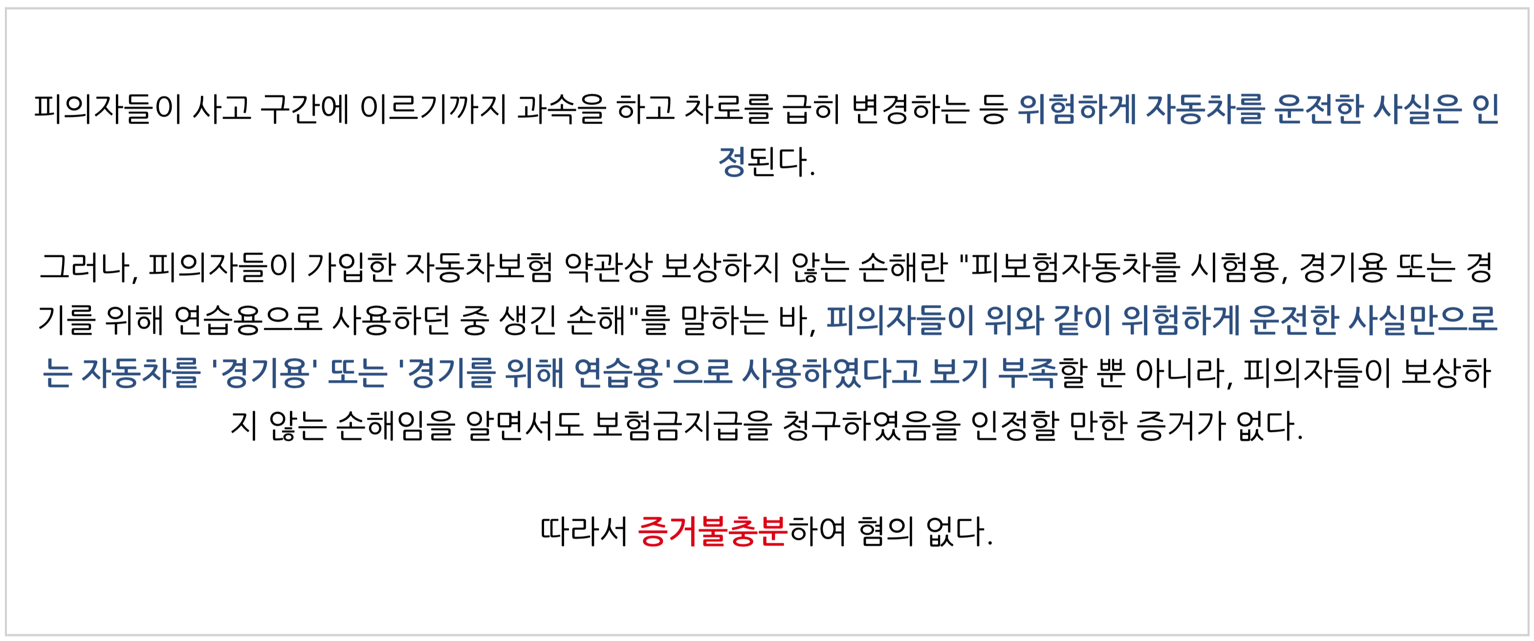하지만 위 규정은 피보험자가 로드레이스나 서킷레이스 등에 경기 출장 자격으로 운전하는 경기 중이거나 경기에 나가기 위해 연습 중에 발생한 사고와 자동차 제조사나 자동차부품 제조사 등이 자동차의 성능을 시험하기 위해 시험운전 중에 발생한 사고에 대해 보험회사가 이를 보상하지 않기 위해 마련된 면책규정일 뿐 일반인들의 일반도로에서의 운행중 사고에까지 적용되는 면책규정은 아니에요. 다시 말해, 설혹 일반인들이 도로에서 경주를 했다 하더라도, 보험약관상의 면책규정을 적용하는 것은 타당하지 않죠.