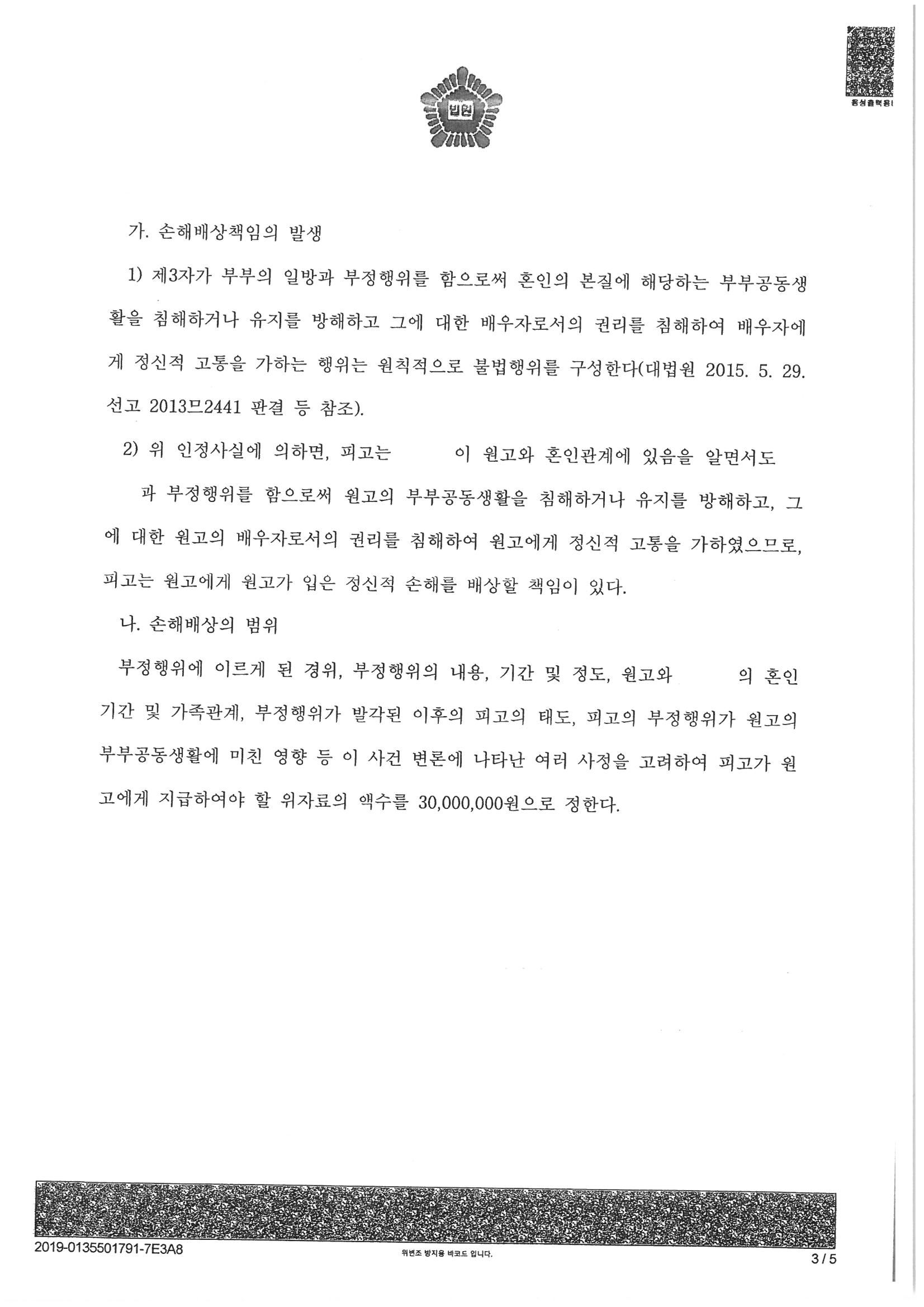 고순례 변호사는 피고는 원고와 김**이 혼인 관계에 있다는 사실을 알면서도 김**과 부정행위를 함으로서 원고의 부부공동생활을 침해하였고 피고는 이로 인한 원고의 정신적 손해를 배상할 책임이 있다고 강하게 주장하였습니다.