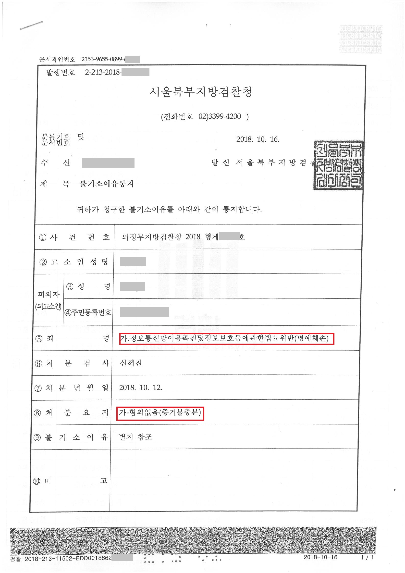 혐의없음(증거불충분) 처분을 받았습니다.