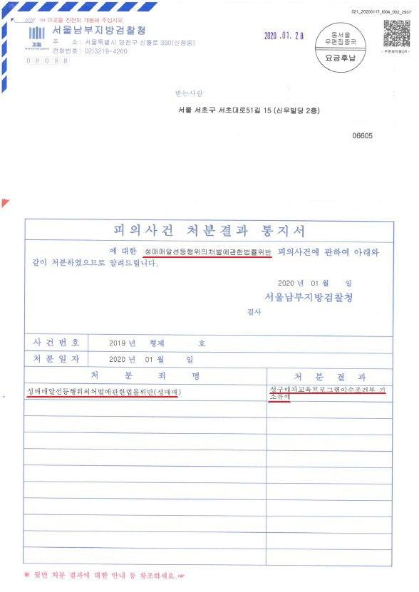 의뢰인님께서는 최근 성매매 처벌 수위에 비추어 벌금형이 선고될 위험이 높은 상황이었습니다. 그러나 앞서 말씀드린 다양한 방법으로 경찰, 검찰 수사 단계를 신중히 진행하였고 이에 서울남부지방검찰청은 의뢰인님에게 "교육조건부 기소유예"처분을 내렸습니다.