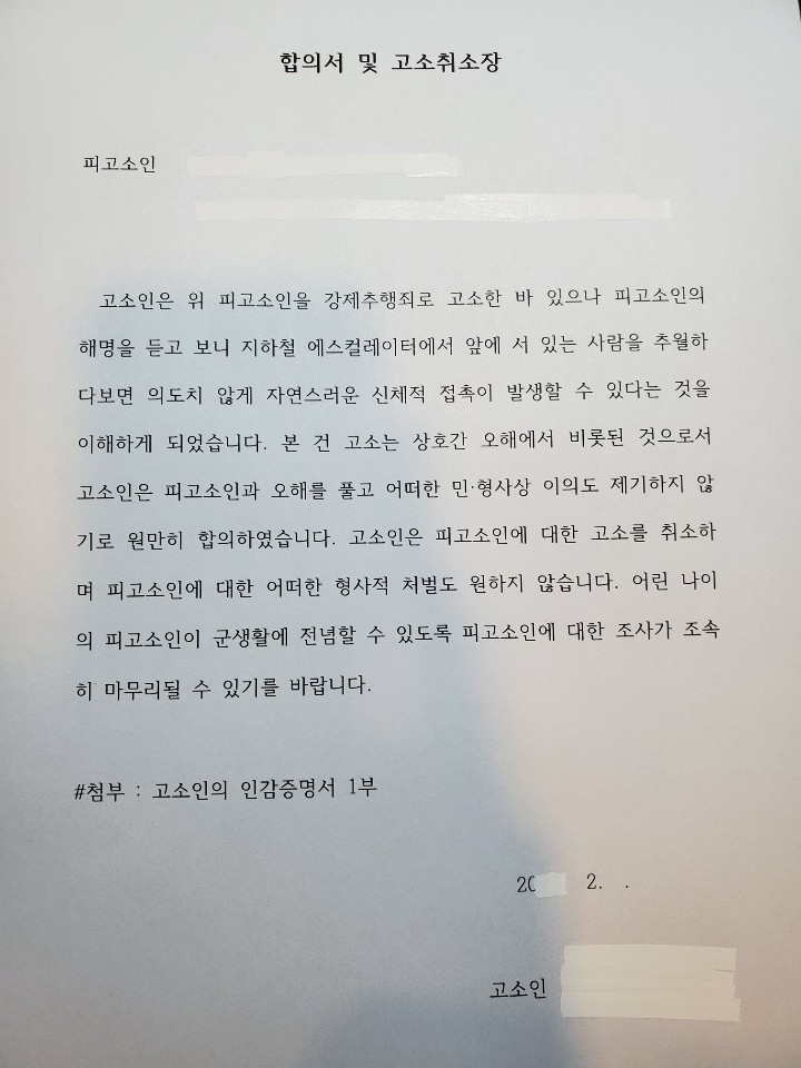 반드시 불기소처분을 받아야 하는 상황이었기 때문에 아래와 같은 내용의 ‘합의서 및 고소취소장’을 미리 작성하여 가서 합의금과 맞교환하는 방식으로 서명 날인을 받아 제출하였기 때문에 결과적으로 무혐의 처분을 받을 수 있었습니다.