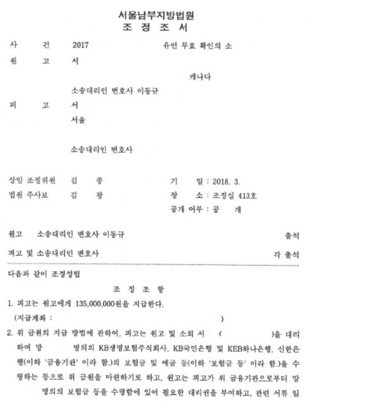 - 아래 사건은 캐나다 시민권인 의뢰인분이 국내에서 유언무효 소송을 제기한 후 유류분 상당액을 조정을 통해 받아낸 사건입니다.