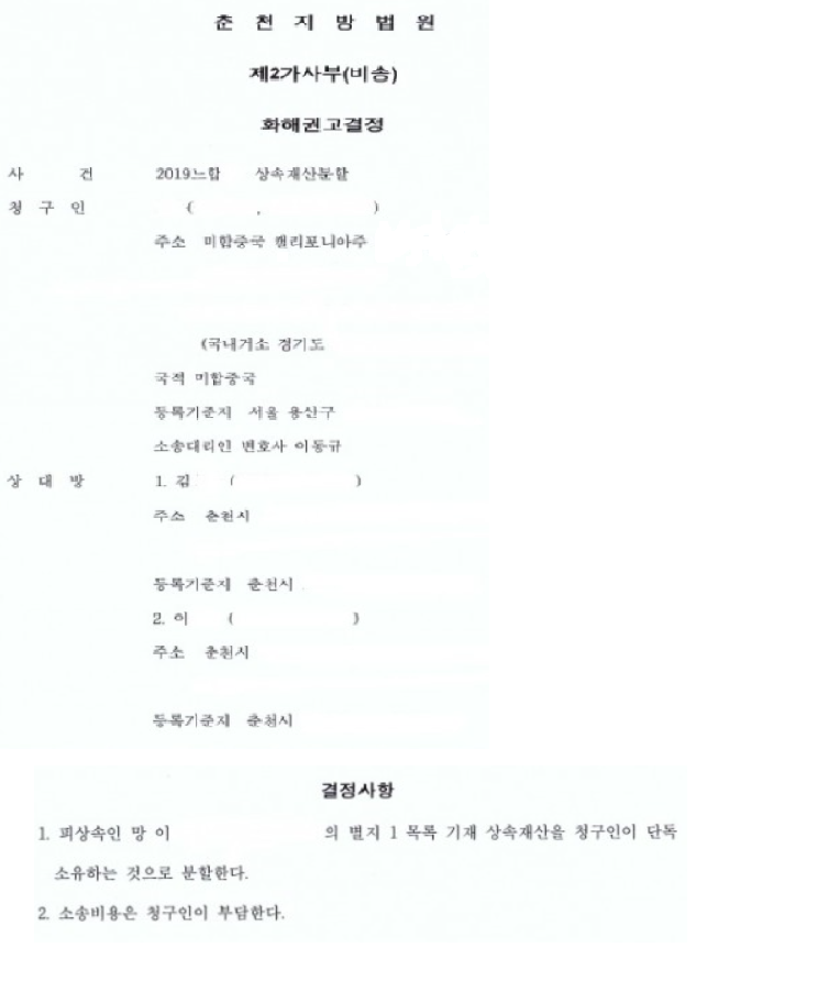 - 이에 저희 사무실은 일단 미국에서 적법하게 혼인신고를 한 서류들을 준비하여 한국에서 혼인신고를 하게 되었고, 가족관계등록부에 이름을 올린 후 바로 상속재산분할심판청구의 소를 제기하여 남편의 재산 기여도가 거의 대부분이라는 주장을 하였으며, 상대방인 사망한 아내측 부모님들도 이를 인정하여 법원의 화해권고결정으로 사건을 신속히 종결 시킬 수 있었고, 결국 8억 원의 재산을 단독으로 상속받을 수 있게 되었습니다.
