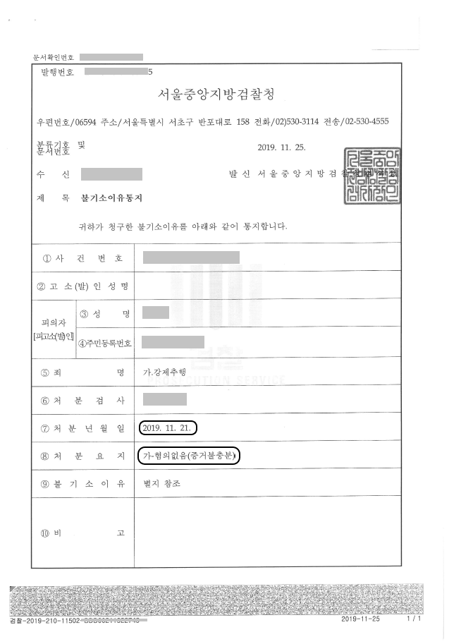 검찰은 손조흔 변호사의 주장을 받아들여 '키스를 한 사실은 인정되나 여러가지 사정을 종합하면 강제추행의 고의가 있었다고 보기 어렵다'라는 이유로 혐의 없음 처분을 하였습니다.