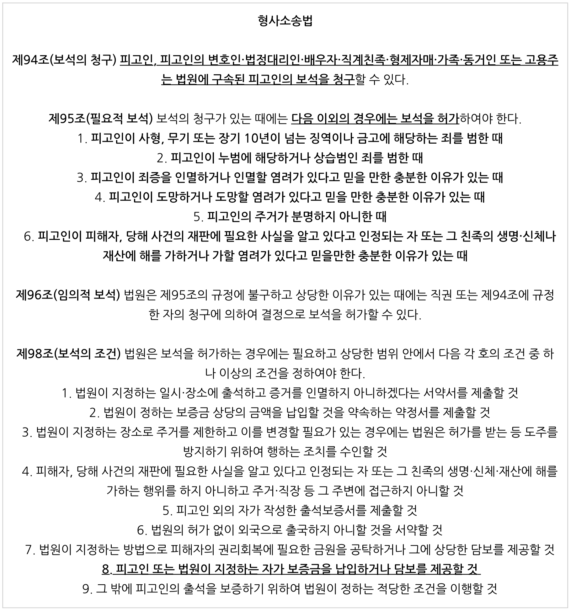 때마침 '보석심문기일'이 잡혔다는 통보가 왔어요. 그럼 보석심문기일에서 우리의 전략은?? 결국 전략의 핵심은 '형사소송법'에 다 나와 있어요. 우리 형사소송법 제95조는 필요적 보석사유를 규정하고 있어요. 즉, 형사소송법 제95조 각호의 사유에 해당하지 않는다면 재판부는 보석을 허가해야 하죠. 때문에, 피고인에게 필요적 보석사유가 허가되지 않는 예외사유가 없다는 사실을 잘 적시해 재판부를 설득해야만 해요.