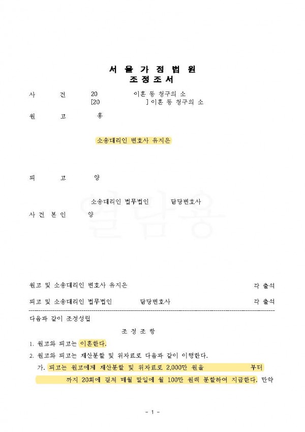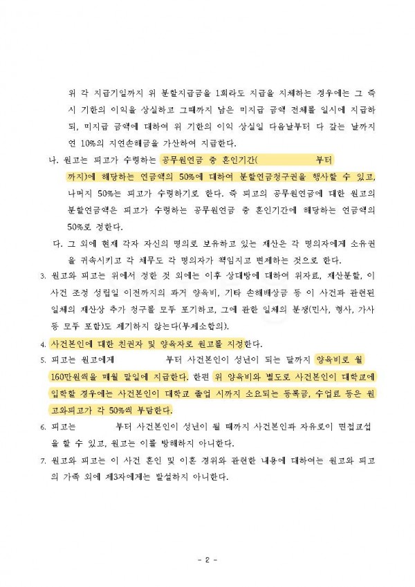 결국, 소송을 제기한 지 4개월 만에 이혼이 성립하였고, 위자료 및 재산분할로 2천만 원을 받아올 수 있었으며, 통상적으로 인정되는 양육비 액수보다 많은 160만 원 및 대학 등록금 및 수업료의 절반을 받아오는 내용으로 성공적으로 조정이 성립하였습니다. 또한 조정조서에도 남편이 향후 수령할 공무원연금액의 절반에 대하여 분할연금청구권을 행사할 수 있다는 조항이 명시되었습니다.