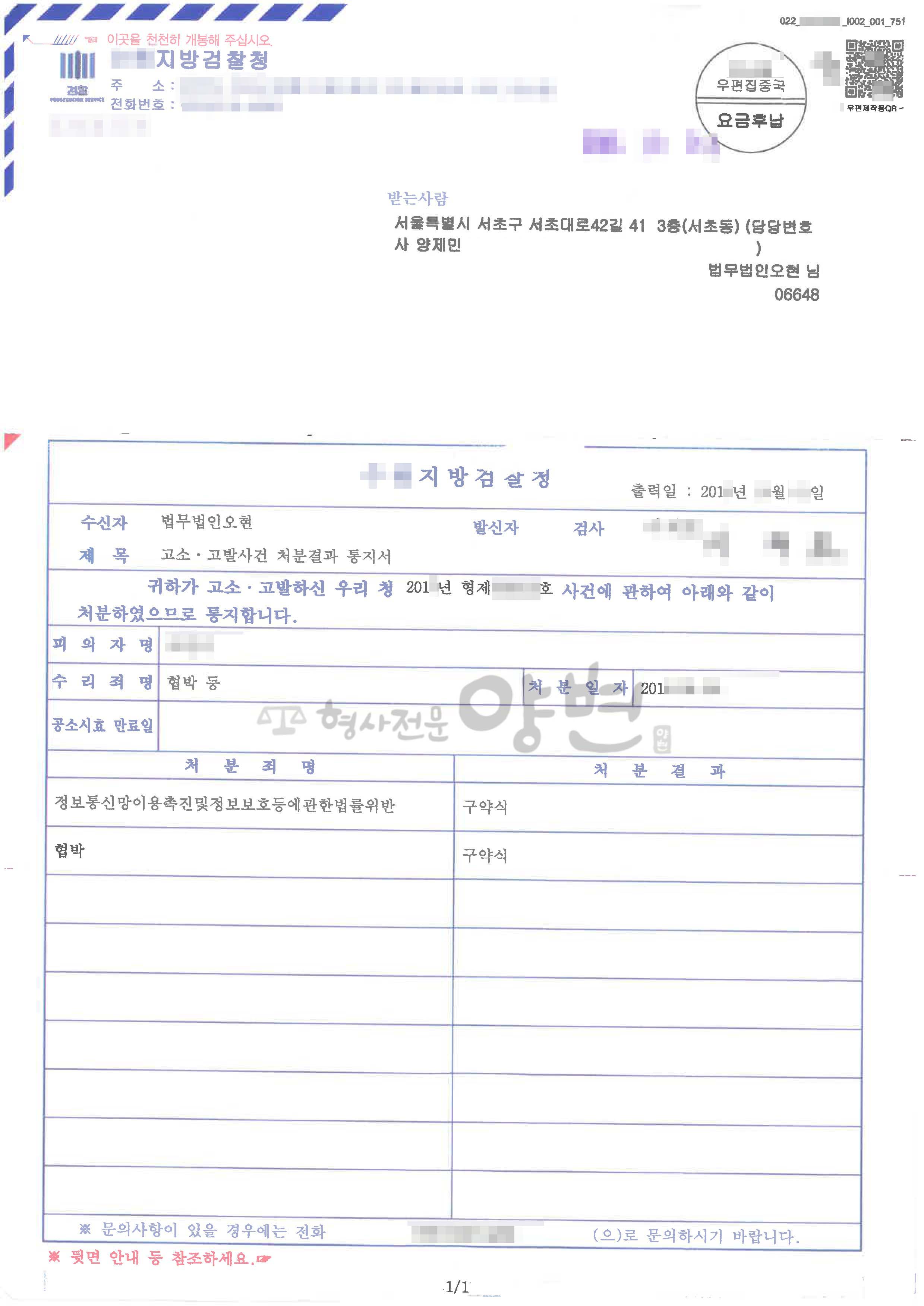 담당검사는 가해자에 대하여 협박, 정보통신망법위반(불안감유발문자등) 모두 혐의가 인정된다고 하면서 약식 #기소처분 하였습니다.