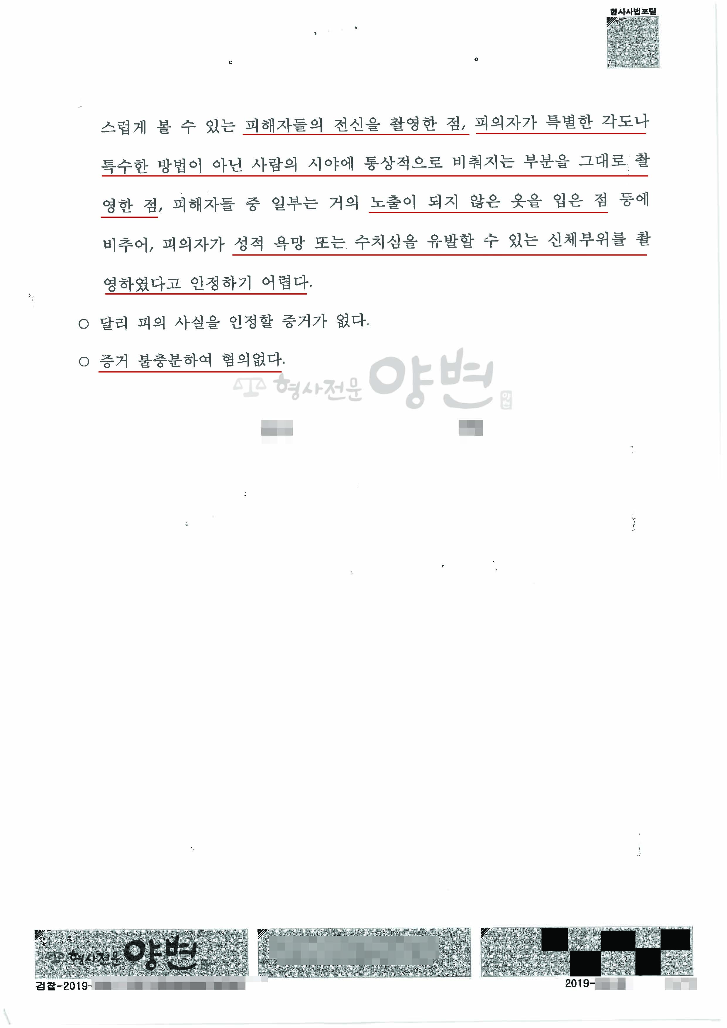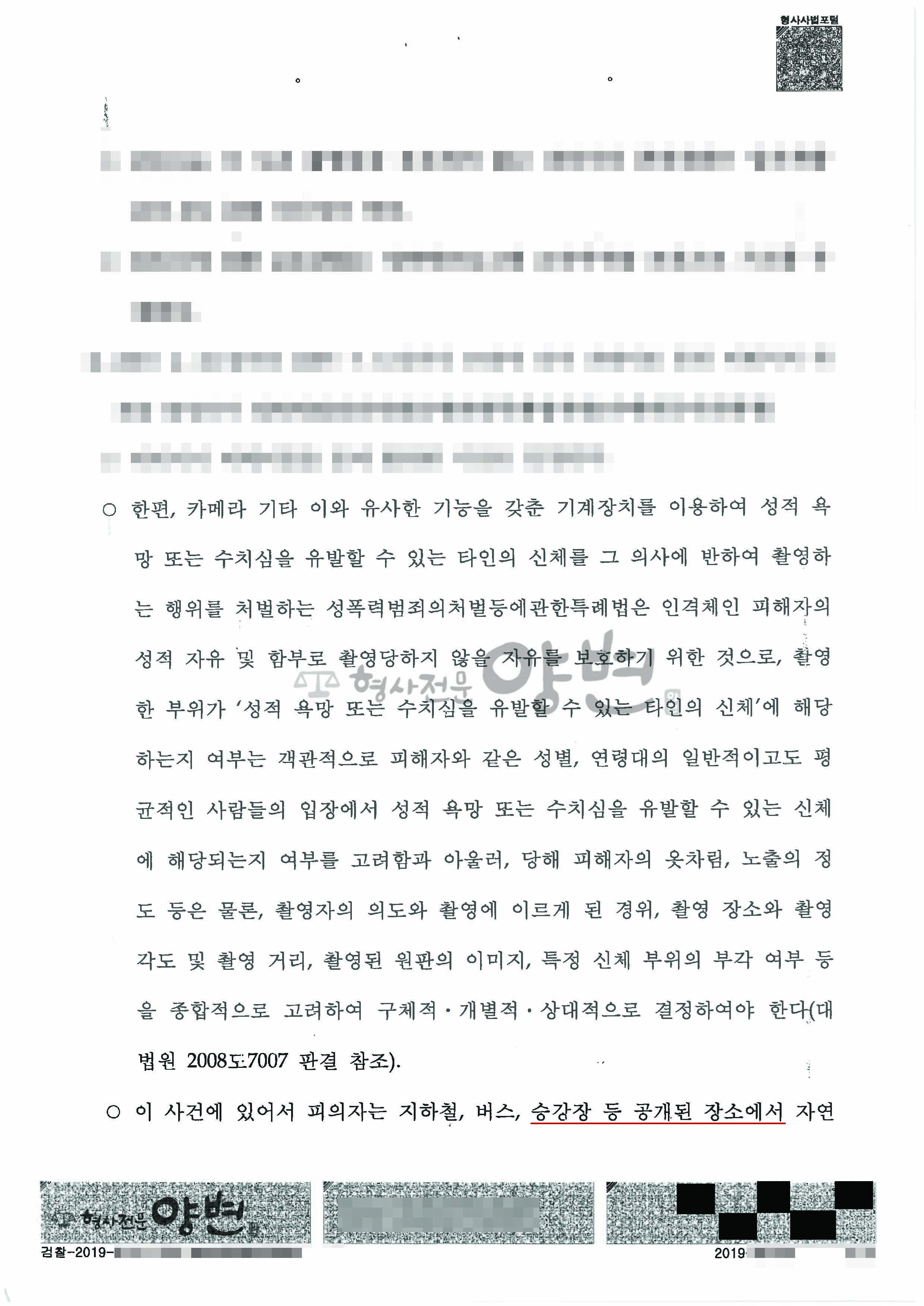 그리고 이를 종합하여 의뢰인이 동의없이 피해자들을 촬영한 사실은 인정하지만, 성적 욕망이나 수치심을 느끼게 하는 사진에 해당하지 아니하는바 법리적으로 죄가 되지 않는다는 변론 방향을 설정하였습니다. 그리고 변호인의견서를 작성하여, ① 사람의 시야로 자연스럽게 볼 수 있는 전신을 촬영하였다는 점, ② 촬영시 특별한 각도나 방법을 사용하지 않았다는 점, ③ 피해자들이 성적 욕망을 유발할 정도로 노출하지 않았다는 점 등을 주장하였습니다.