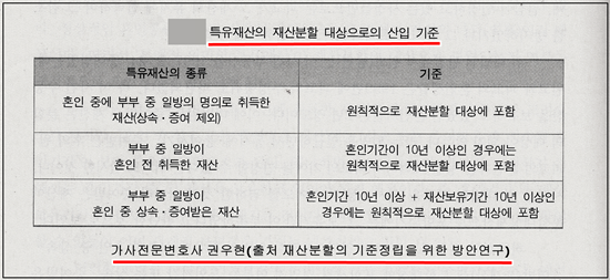 3. 그런데 대법원 산하 사법정책연구원( 구 사법연수원 건물 내 위치 )에서 발간한 연구서에 의하면 위와 같은 경우 분할대상 여부에 관한 원칙적인 기준을 제시하고 있으므로 협의이혼 내지 재판상이혼시 참조할 수 있겠네요. 아래 기준에 의하면, 남편이 결혼 전 시부 사망으로 인하여 저 멀리 시골의 선산을 상속받았고 남편과 혼인기간 10년 정도만 유지하면 그 선산을 처도 분할받을 수 있다는 것입니다.