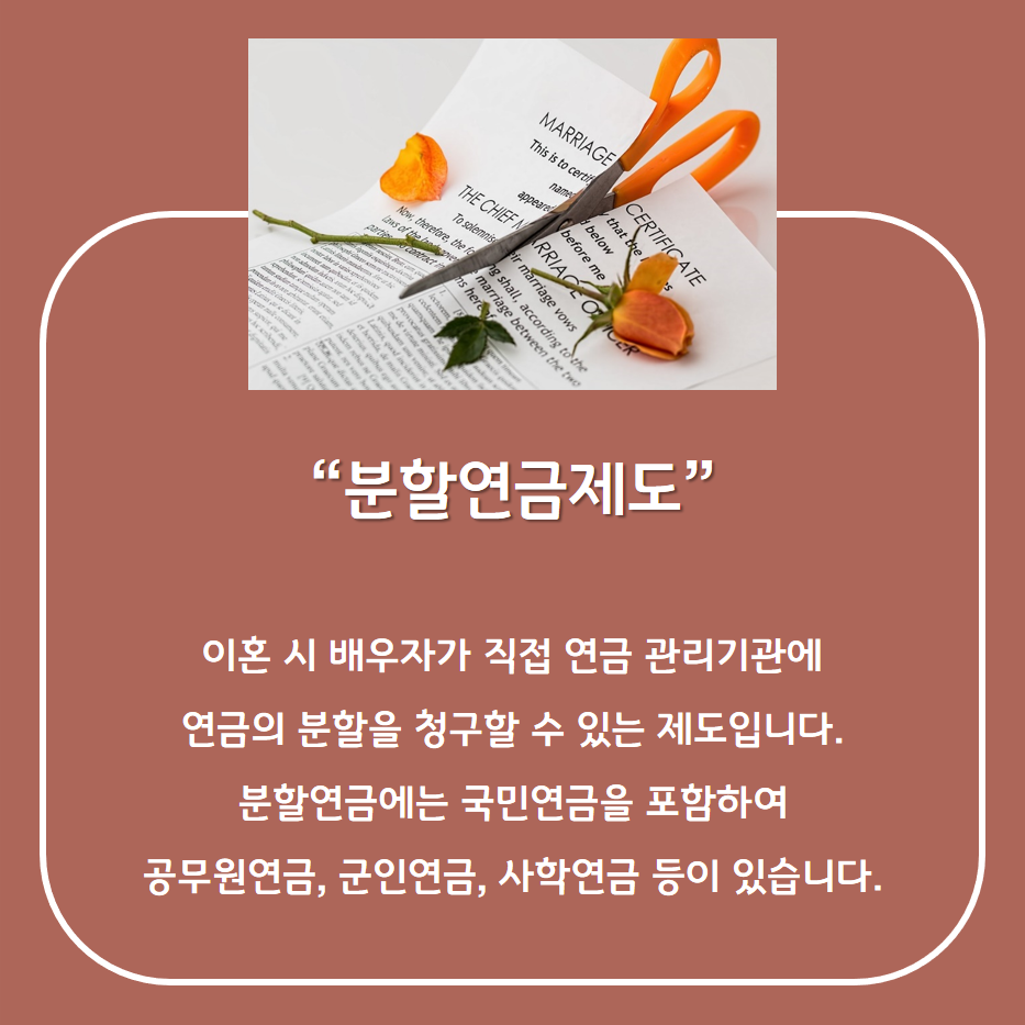 오늘은 이혼할 때 재산분할에 합의했어도 국민연금 분할 신청이 가능하다는 법원의 판결이 있어 소개해드리고자 합니다. ‘분할연금제도’란 상단의 설명과 같이 이혼 시 배우자가 직접 연금 관리기관에 연금의 분할을 청구할 수 있는 제도입니다.
