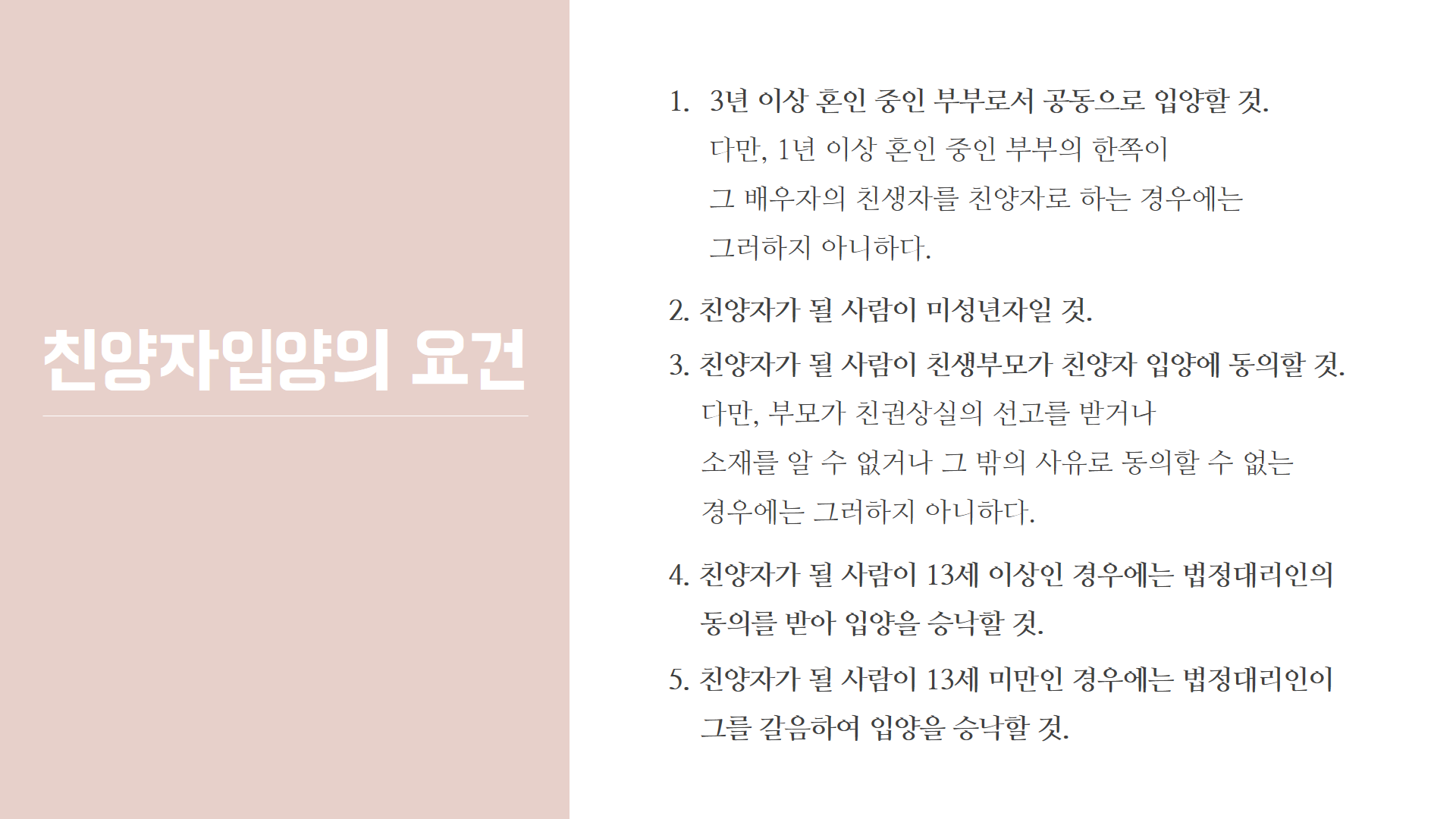 가정법원은 친양자가 될 사람의 복리를 위하여 그 양육상황, 친양자 입양의 동기, 양부모의 양육능력, 그 밖의 사정을 고려하여 친양자입양에 대한 허가심판을 하며, 그중 특히 친양자 입양을 하려는 부모가 입양에 적합한 능력과 조건을 갖추었는지가 가장 중요한 기준이 됩니다.