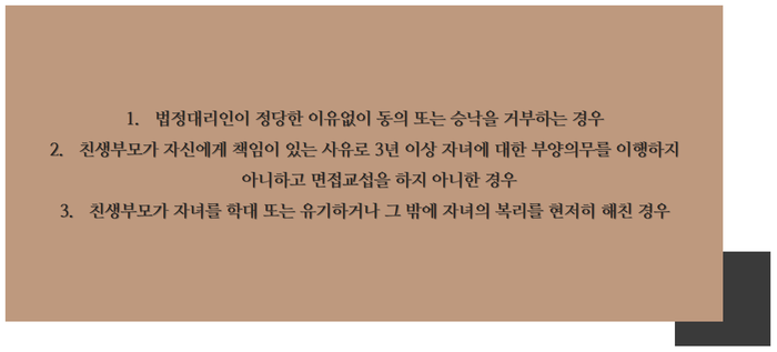 친양자입양 제도는 친생부모와는 친자관계를 절연하게 되므로 그 친생부모의 동의를 받도록 하고 있습니다. 친양자입양 심판청구를 문의하시는 분들이 하시는 질문 중에 가장 많은 질문은 전 배우자가 동의를 안 해줄 것 같다거나, 그 여부에 대하여 확신이 들지 않는데, 그런 경우에도 심판청구가 가능하냐는 것입니다. 결론은 가능하나, 아래와 같은 사유가 인정되어야 합니다.