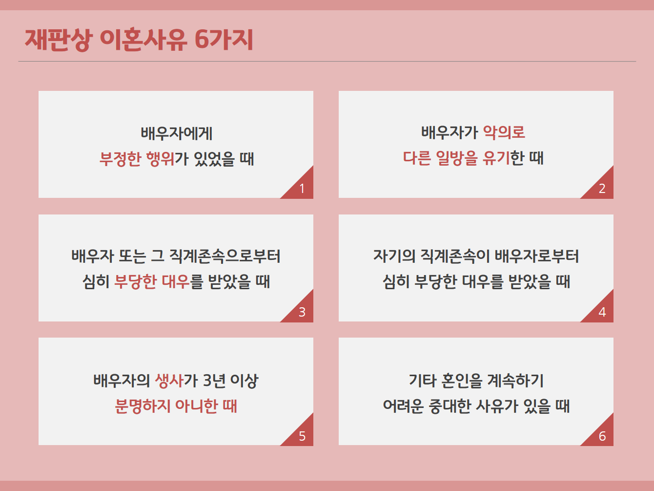 ‘유책 배우자’, 이혼의 원인, 즉 혼인 생활의 파탄의 원인을 제공한 일방의 혼인 당사자는 재판상 이혼을 청구하여도 받아들여 주지 않았습니다. 협의이혼을 진행하더라도 유책 배우자 입장에서는 재산분할 등과 같은 과정에서도 불리한 입장에 놓이기도 했습니다. 그러나 최근에는 유책 배우자의 이혼 청구의 사유로 받아들여지는 사유에 대해서도, 아래의 6가지 이혼 사유 중 ‘기타 혼인을 계속하기 어려운 중대한 사유’를 근거로 하여 유책 배우자라 할지라도, 이미 혼인생활을 지속할 수 없는 상태가 계속되는 경우라면 파탄을 이유로 이혼청구를 할 수 있도록 인정하는 추세입니다.