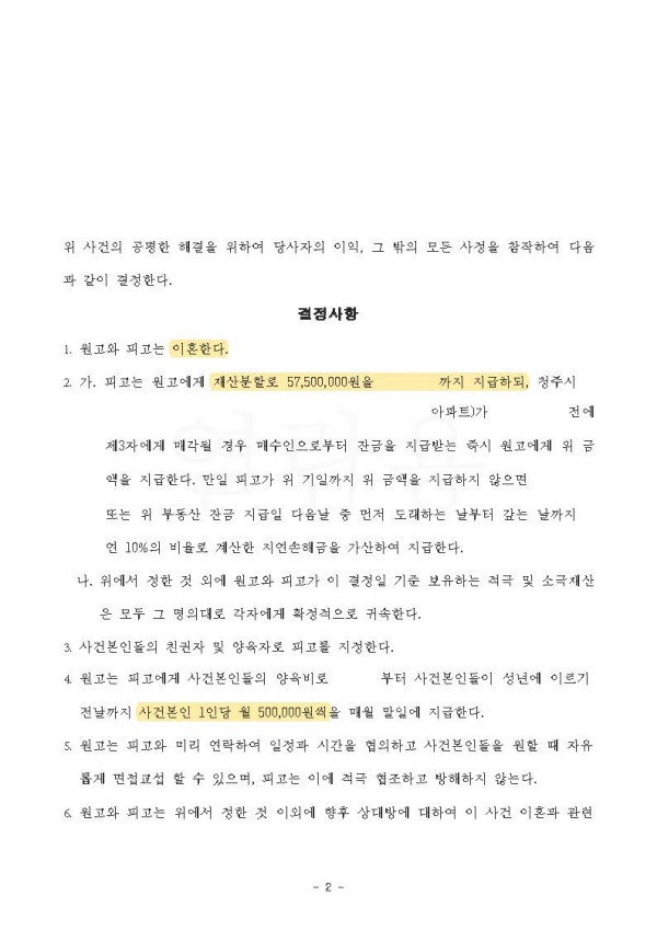 통상적으로 이혼 소송을 제기하면 최소 6개월에서 길면 3년까지 기간이 소요되는데, 이 사건의 경우 소송을 제기한 지 2개월 만에 이혼하면서 재산분할로 50%인 57,500,000원을 지급받고, 양육비로 1인당 50만 원을 지급하는 내용으로 상대방과 원만히 합의가 성립하였고, 결국 의뢰인이 원하는 내용대로 잘 마무리된 사안입니다.