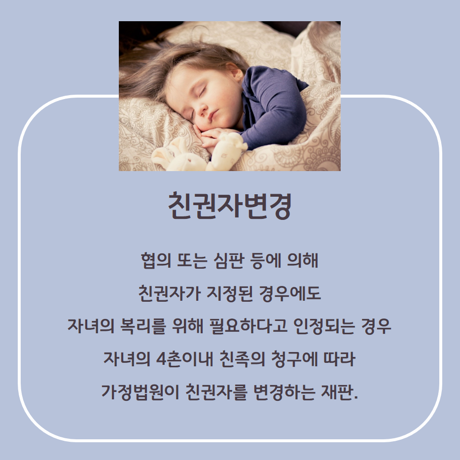 친권자 변경 신청은 친권자가 지정된 상태에서 자녀의 복리를 위해 필요하다고 인정되었을 때에는 자녀의 4촌 이내 친족의 청구에 따라 가정법원이 친권자를 변경하는 재판이 이루어지는데, 협의가 있다고 하더라도 가정법원의 심판을 통해 결정이 됩니다.