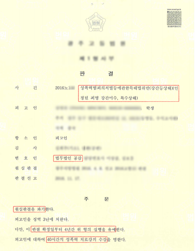 - 이에 따라, 종전 성폭력위반죄에 대하여 강간미수와 특수상해죄로 최종 판단이 되어