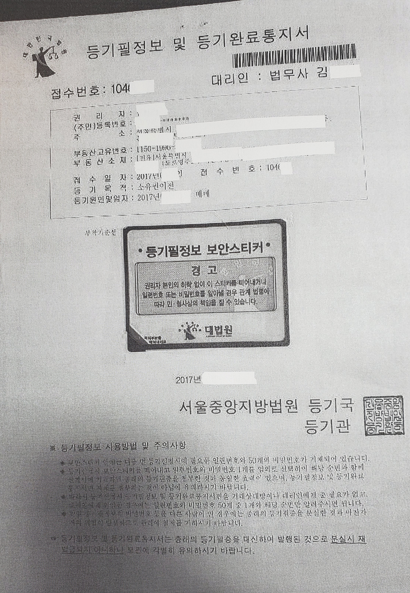 의뢰인에게는 남편에게 이혼을 위한 변호사 선임 등을 알리지 말 것을 조언하였습니다. 이러한 사실을 알릴 경우 증거수집의 점에 있어서 어려워지는 점이 있기 때문입니다. 이러한 상태에서 의뢰인에게 집안에 의뢰인이 살고 있는 아파트 외에 다른 부동산의 등기필증(현재는 등기필정보 및 등기완료통지서)이 있는지 샅샅이 찾아보라고 하였습니다. 결국 장롱 깊숙한 곳에서 아파트 등기필증이 있는 것을 발견하여 이 등기필증을 촬영하여 두었습니다.