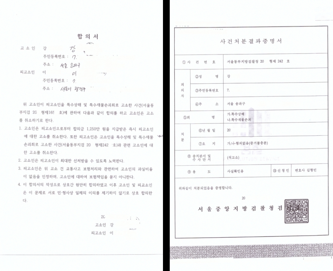 피고소인으로부터 고소취하는 물론 조정이 결렬되었을 때의 조건보다 더 좋은 조건인 수리비 외에 변호사비용 일체를 포함한 금액인 1,250만 원을 받는 것을 조건으로 합의에 이르렀습니다.