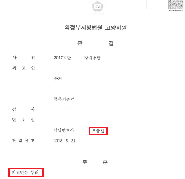 재판부는 사건 초반부터 의뢰인에게 불리한 심증을 가지고 질문을 하였지만, 오승일 변호사의 적극적인 변론결과 무죄를 선고하였습니니다.