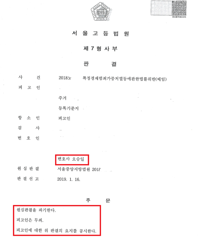 의뢰인은 1심에서 실형 선고를 받았지만 오승일 변호사가 적극적으로 변론한 결과, 항소심은 1심을 파기하고 무죄를 선고하였습니다. 주목할 점은 오승일 변호사의 법리 주장을 더 이상 반박할 수 없자, 검찰은 이례적으로 상고를 포기하였다는 점입니다.