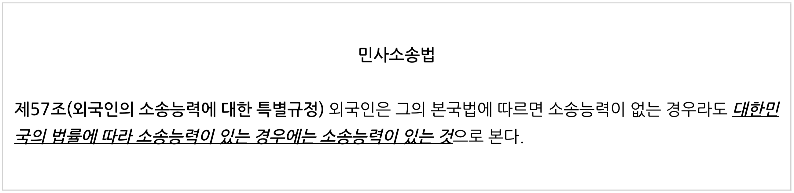 즉, 유효하게 소송행위를 할 수 있는 능력을 소송능력이라고 하는데, 외국인도 이러한 능력이 있는지 의문이 들 수 있어요. 우리 '민사소송법' 제57조는 대한민국 법률에 따라 소송능력이 있다면 소송능력이 있다고 보고 있어요. 여기서 소송능력은 민법상 행위능력자라고 보면 되는데, 미성년자나 제한능력자 처럼 행위능력이 제한되는 경우가 아니라면 국적을 불문하고 모두 소송능력이 있다고 보면 되죠.