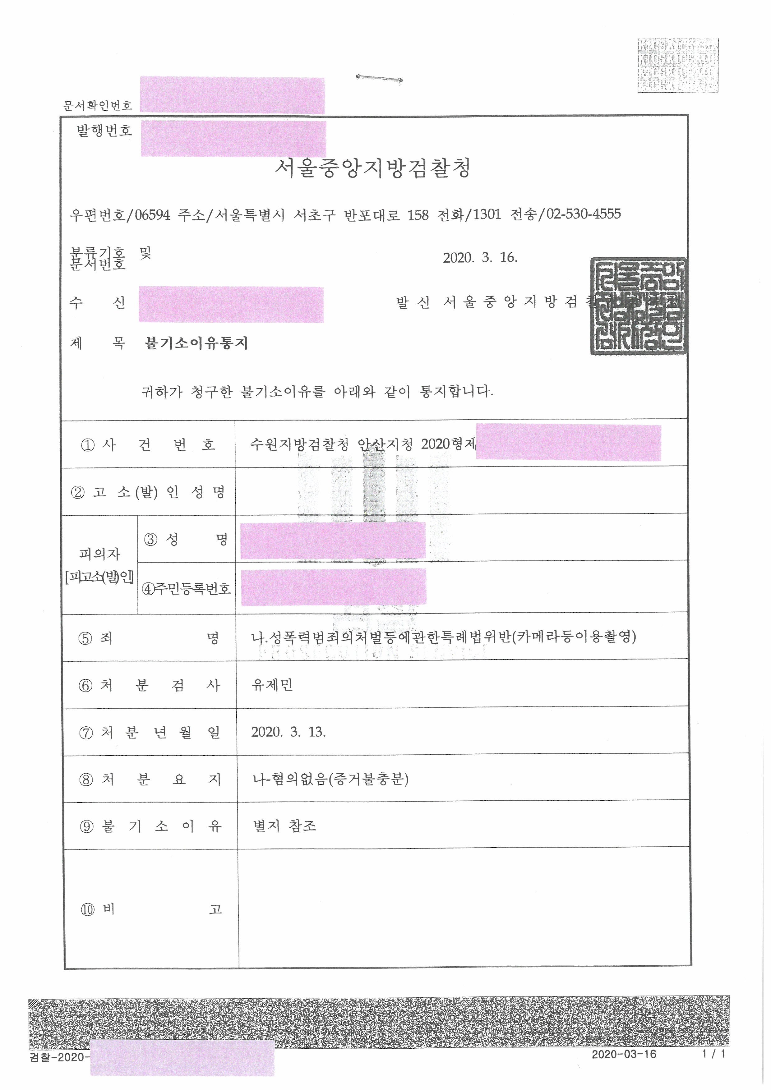 이에 검찰에서는 피의자 성폭력범죄의처벌등에관한특례법위반(카메라등이용촬영)의 혐의에 대하여, 혐의없음(증거불충분) 처분을 하였습니다.