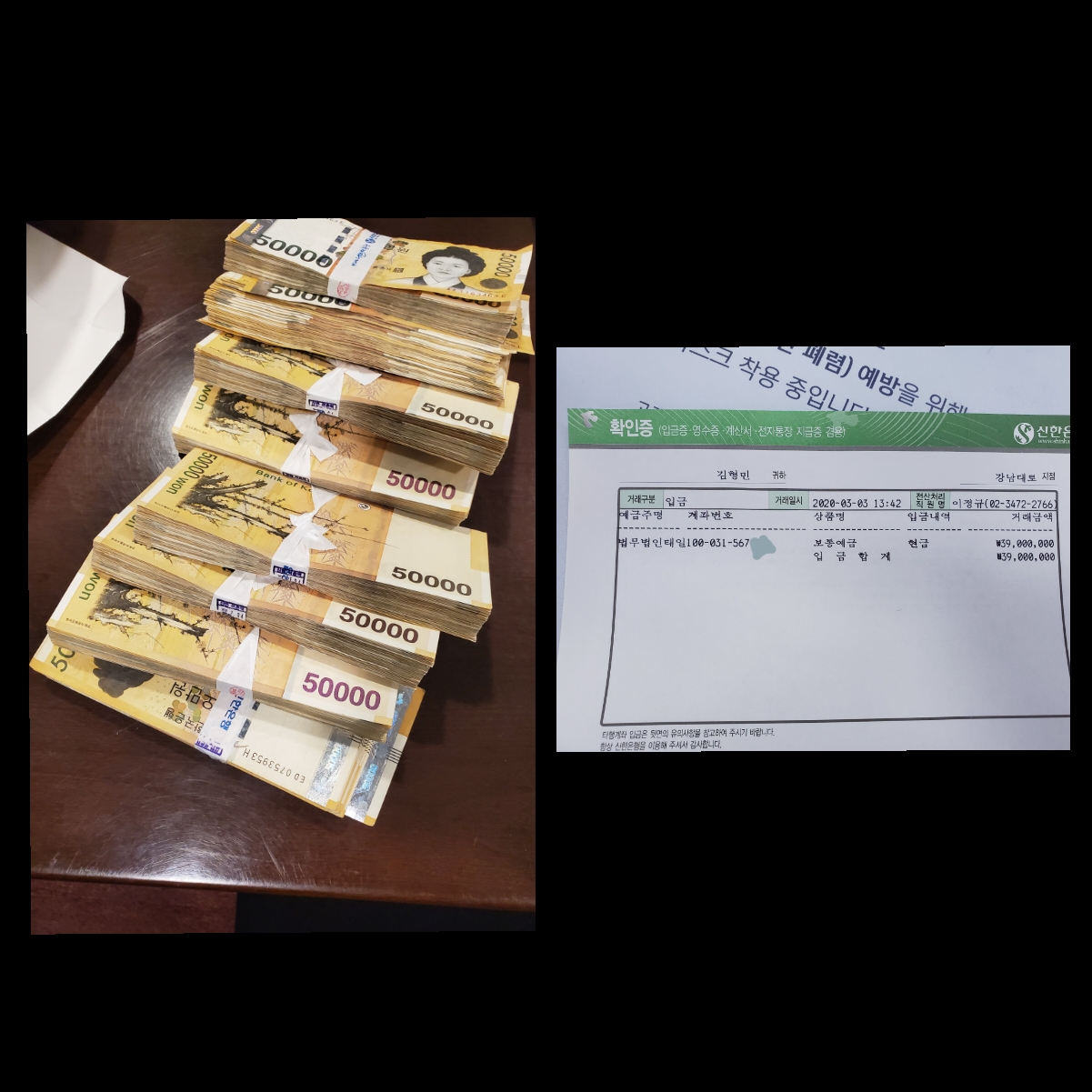 1년 6개월간의 소송 끝에 2억 1,900만 원 승소판결을 받게 되었습니다. 피고들 측에서 항소하였으나 항소심에서 변동될 가능성은 거의 없었기 때문에 결국 합의로 종결되게 되었습니다. 의뢰인은 성공보수를 현금으로 가지고 왔으나 제가 직접 전액 법인계좌에 입금시켰고 받은 금액 그대로 현금영수증을 발행하여 주었습니다.