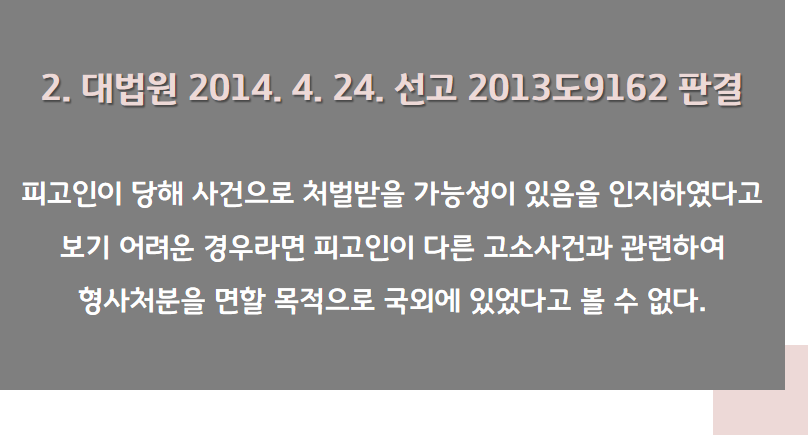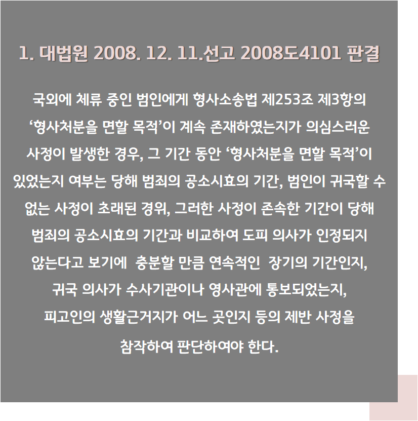원심이 피고인이 ‘형사처분을 면할 목적’으로 해외에 체류하였다고 볼 수 없다고 본 사정들에 ①피고인의 출국 경위, ② 피고인이 해외에서 한국으로 입국하지 못하게 된 사정, ③공소 시효의 기간, ④ 피고인의 인식, ⑤ 피해자의 고소 동기 등에 더하여 원심의 판단은 정한 것으로 수긍되며, 검사의 주장은 받아들이지 않다고 판단하였습니다.