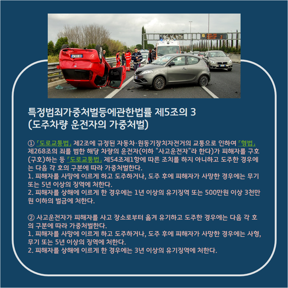 교통사고가 발생하기도 합니다. 교통사고가 발생하고 난 후 사건을 잘 마무리하면 좋지만, 순간적으로 상황에 당황한 나머지 현장을 도주하여 가중처벌을 받는 경우가 종종 있습니다. 흔히 ‘뺑소니’라고들 부르는 그런 경우입니다.