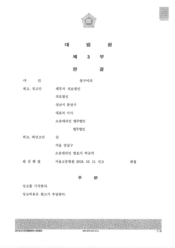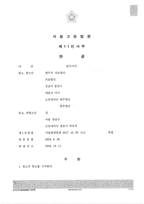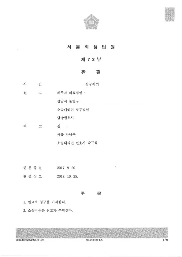 의뢰인은 회생절차가 진행 중인 의료법인에 대하여 30억원의 채권이 있었는바, 의료법인은 위 채권에 대하여 부인권을 행사하면서 청구이의의 소를 제기하였습니다.