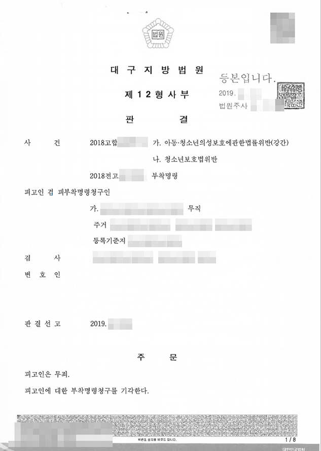 아동청소년성보호에관한법률(아청법) 위반 강간 혐의로 구속상태에서 조력을 받아, 무죄 판결을 받은 성공사례가 있어 소개합니다.