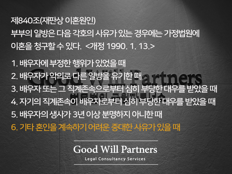 결혼보다 몇 배는 어려운 것이 이혼입니다. 깔끔한 끝이 있어야 아름다운 시작이 있을 수 있습니다. 오늘은 민법이 정하고 있는 이혼 사유에 명확하게 해당하지 않는 경우에도 이혼이 가능한지 알아보도록 하겠습니다.