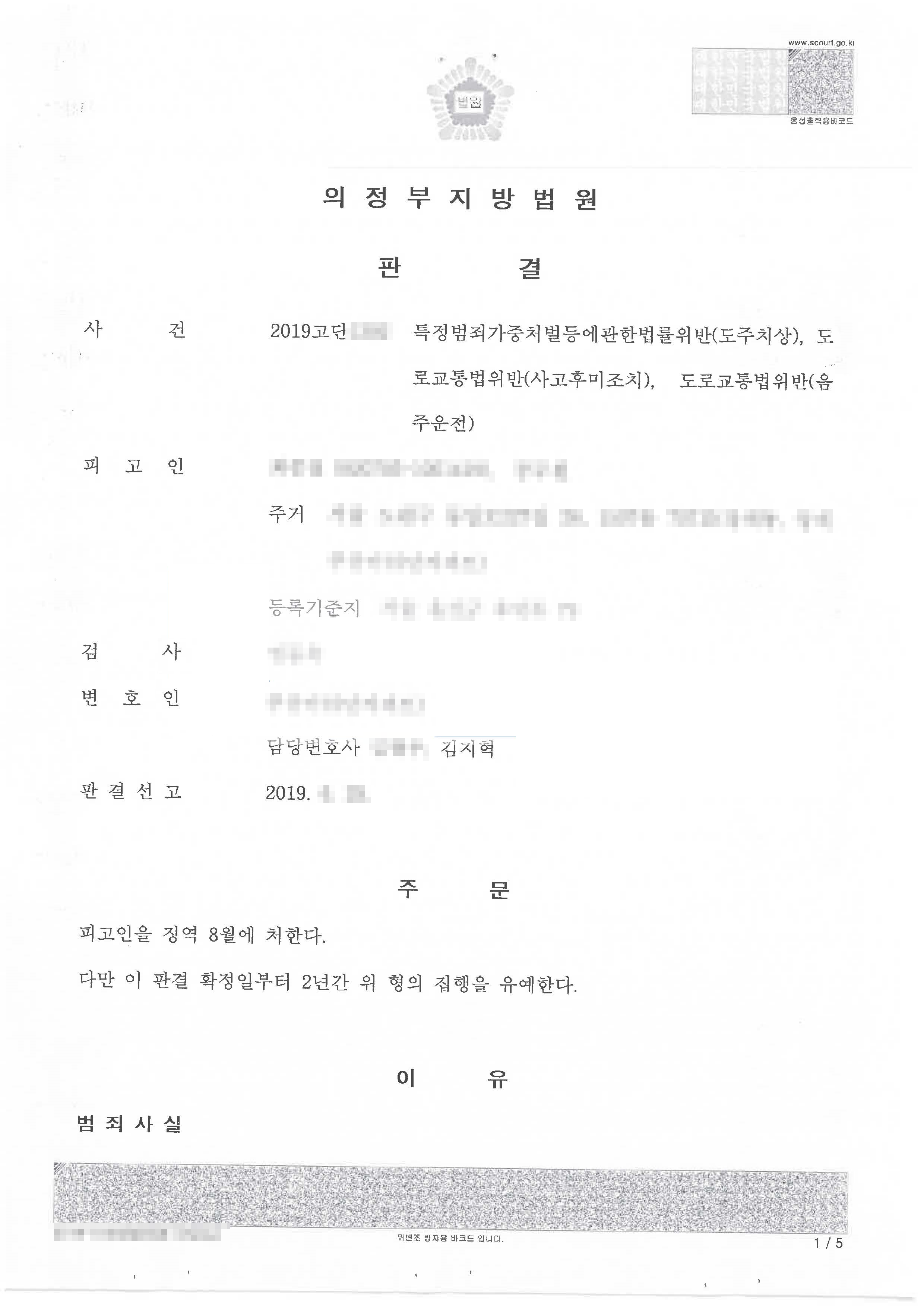 이에 의뢰인을 돕기로 한 즉시, 담당수사관을 통하여 상대방 운전자에게 연락을 취하였고, 의뢰인의 사정에 대하여 읍소한 끝에 추가적인 진단서를 제출하지 않는 것을 조건으로 합의에 이를 수 있었습니다. 또한 의뢰인이 위와 같은 음주뺑소니 사고를 내게 된 경위를 자세히 설명하고, 현재 의뢰인이 실형을 피하여야 하는 사유 및 재발방지 의지를 적극적으로 담은 변호인의견서를 제출하였습니다.