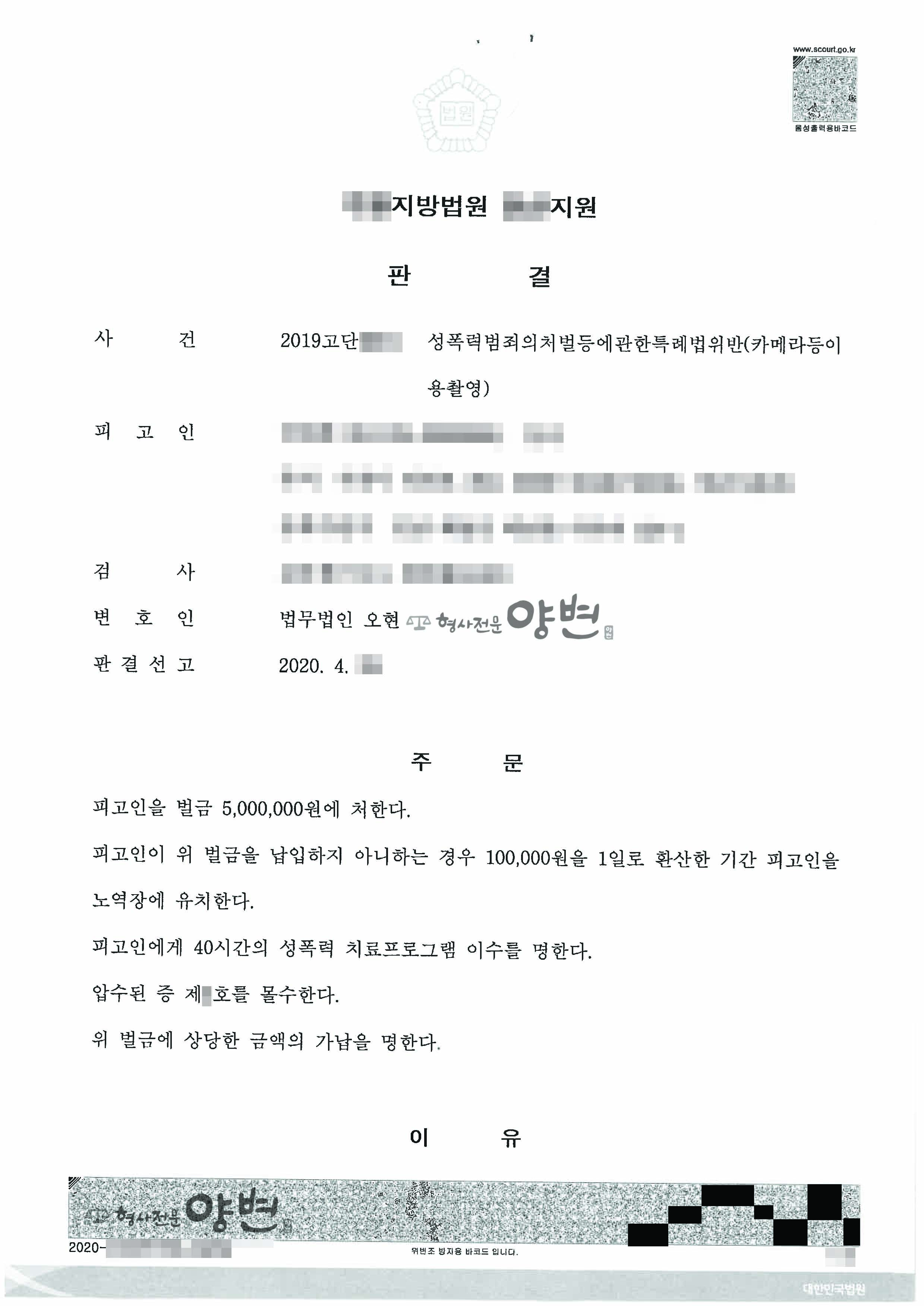 변호인의견서 등을 참작한 재판부는 의뢰인에 대하여 ‘벌금형 및 취업제한면제’를 선고하였습니다.