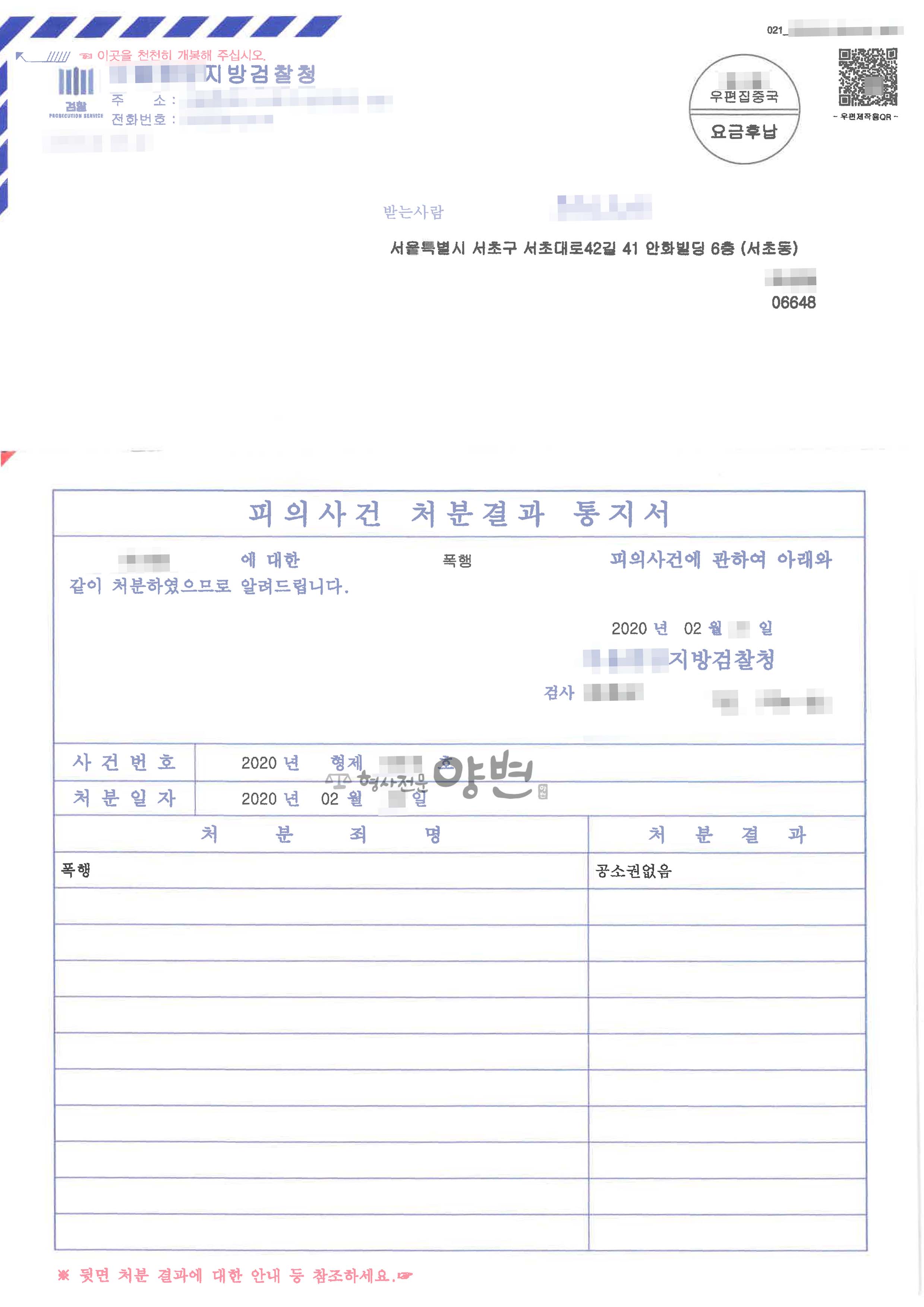 담당검사는 의뢰인의 죄명을 ‘폭행’으로 의율하되 피해자와의 합의를 고려하여 ‘공소권 없음’ 처분하였습니다.