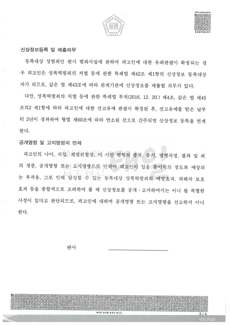 변호인은 피고인이 피해자와 원만히 합의를 하도록 하였고, 이와 별도로 피고인의 양형들에 대하여 자료를 제출하고 피고인의 가벌성이 현저히 낮다는 사실들에 대해서 변론을 하여 선고유예를 이끌어 냈습니다. 피고인은 벌금형이라도 인정이 되었다고 한다면 10년간 신상정보등록의 불이익을 얻었을 것인데, 선고유예 판결을 받음으로써 2년간 신상정보등록을 하는 것으로 사건을 마무리 할 수 있었습니다.