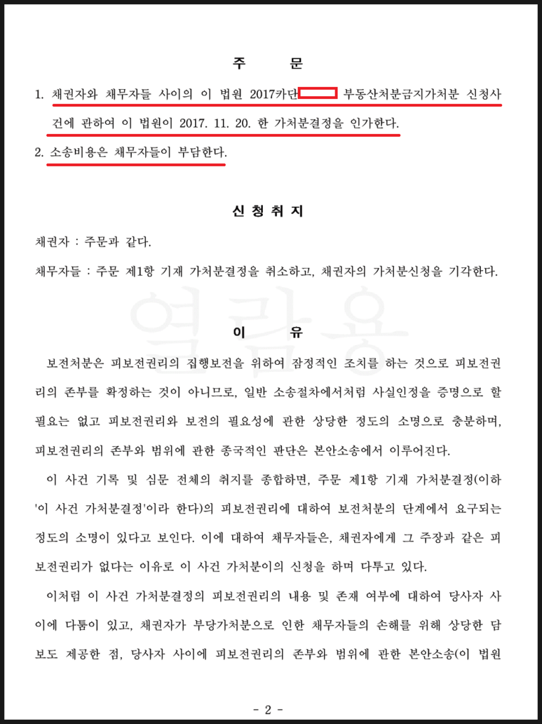본 변호사는 상대방의 주장에 대하여 미리 검토를 마친 대법원 판례를 제시하면서, 부동산 전부에 대한 처분금지가처분 결정을 한 법원의 판단이 타당하다는 반박을 하였고, 상대방이 증인으로 신청하겠다는 확인서 작성자의 경우 그 증거신청 방식이 가처분이의 사건에서 제한하는 소명의 방식과 맞지 않을 뿐더러, 입증하겠다는 주장 자체가 허위인 사정을 자료와 함께 충분히 제시하였습니다(상대방이 신청한 증인은 의뢰인을 사기 등 혐의로 고소한 사람이었으나, 의뢰인이 상대방과의 가처분이의소송에서 승소하자 고소를 취하하고 오히려 의뢰인에게 합의금을 지급하기 까지 하는 등 의외의 분쟁이 저절로 해결되기도 하였습니다).