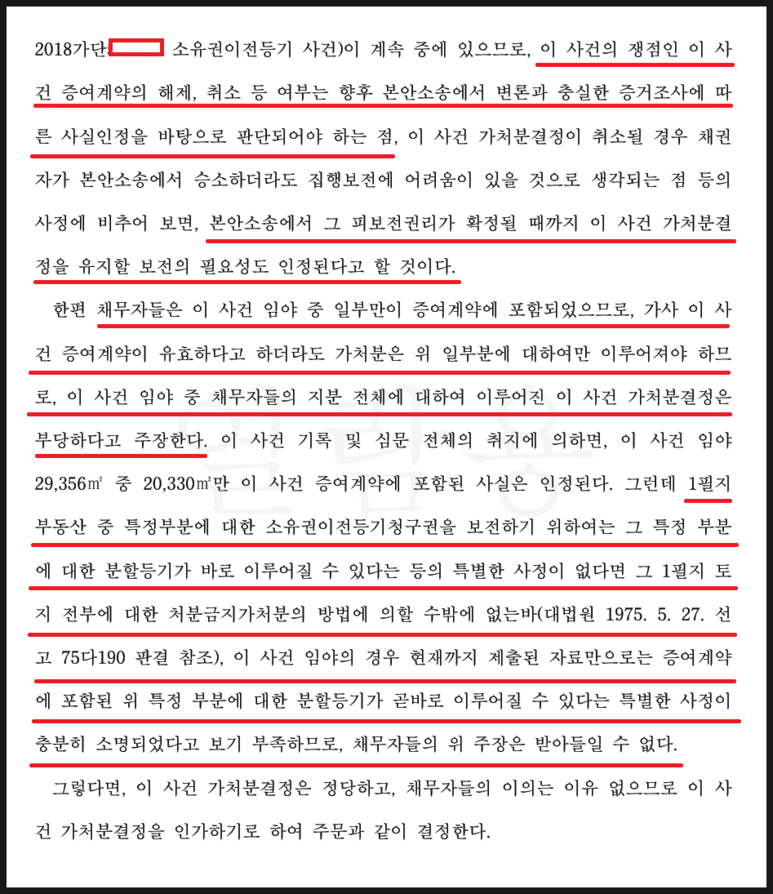 ① 1필지 토지 일부에 대하여 부동산처분금지가처분 결정을 받는 것보다, 1필지 토지 전부에 대하여 부동산처분금지가처분 결정을 받는 것이 더 유리하고, 또 그것이 법리에 맞다고 제시하였고,