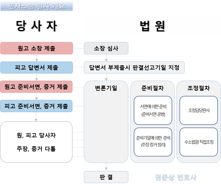 민사소송은 보통 아래와 같은 절차에 따라 진행됩니다.